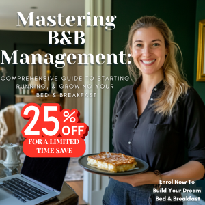 The “Mastering B&B Management: Comprehensive Guide to Starting, Running & Growing Your Bed & Breakfast” is a step-by-step course for aspiring and current B&B owners who want more bookings, happier guests, and higher profits.